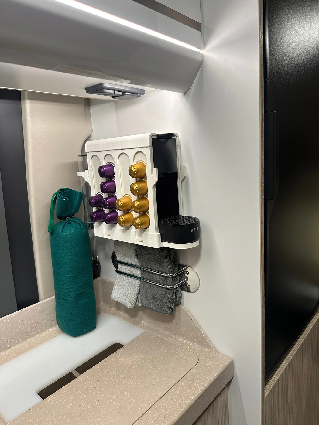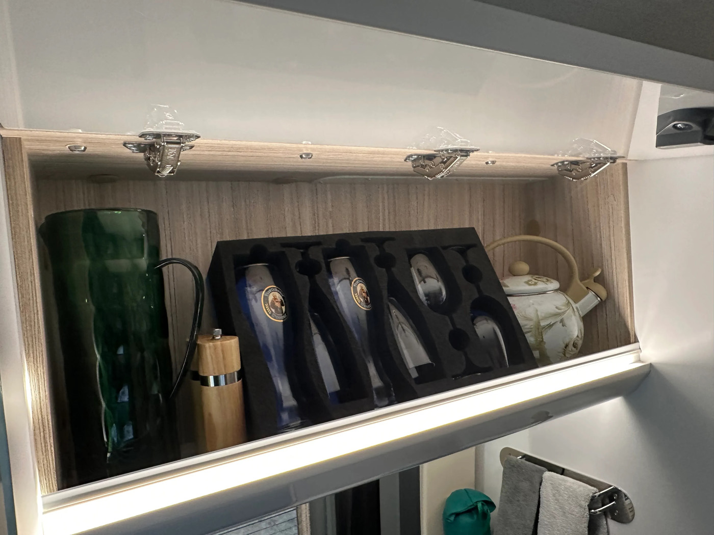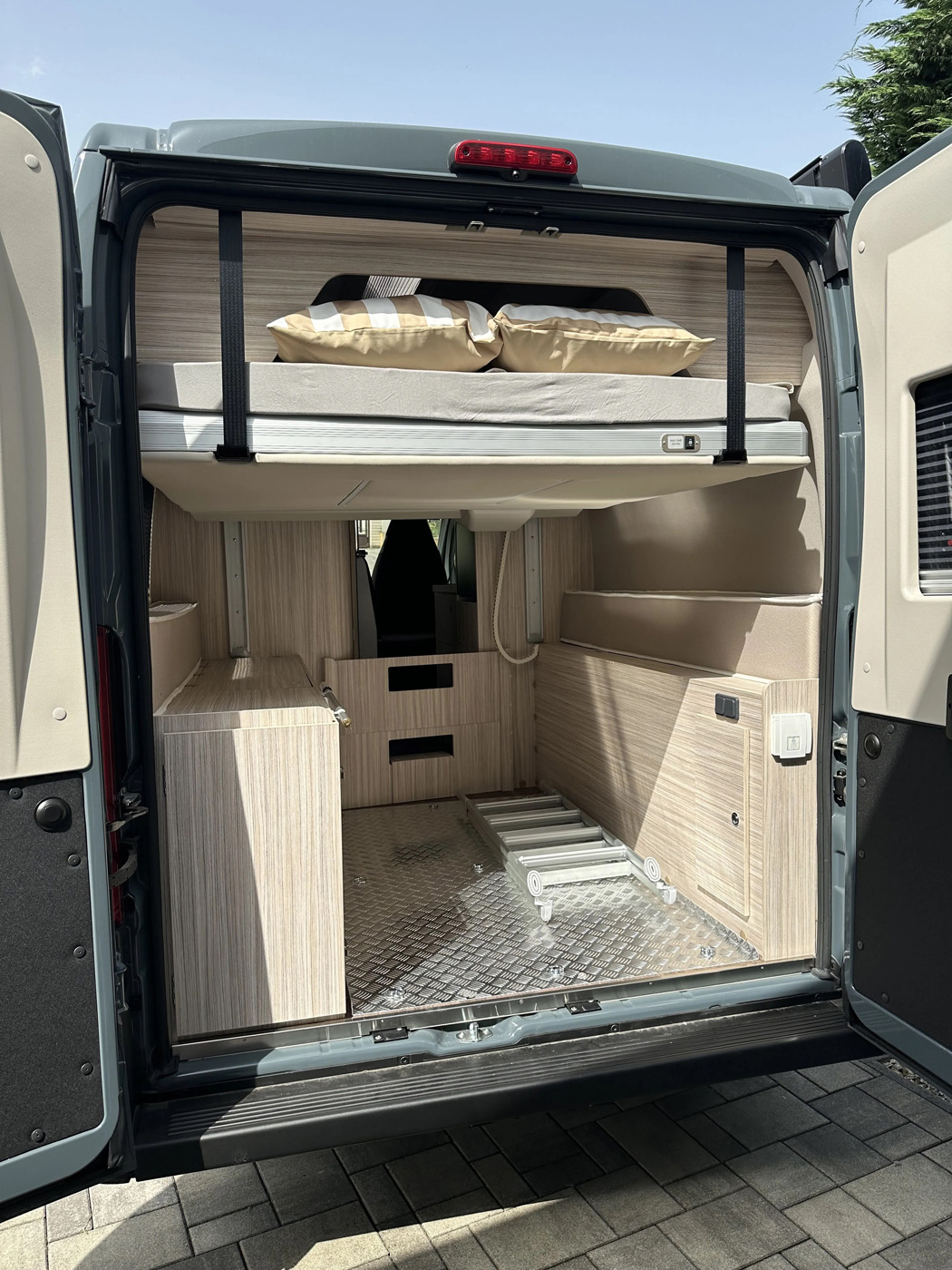 vyrovnávací klíny, sada nářadí, startovací kabely, hadice na vodu, konev, sněhové řetězy, vyhřívaná odpadní nádrž, prodlužovací kabel, chemie do WC, toaletní papír, lůžkoviny, fén na vlasy, nádobí a příbory, parkovací senzory